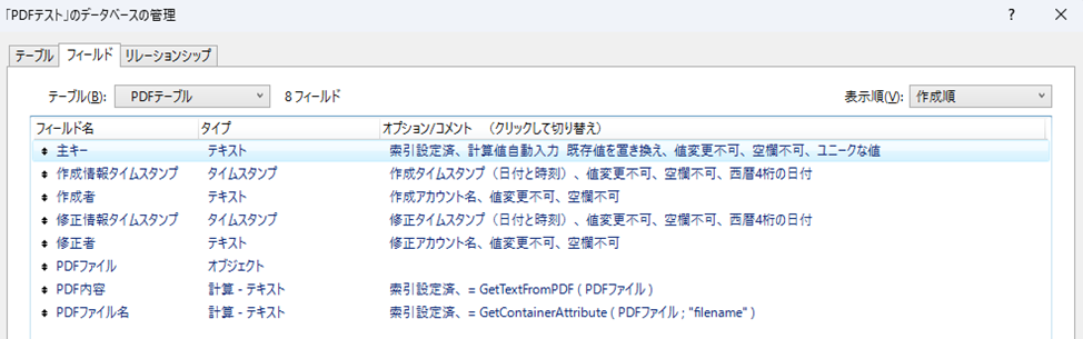 検証始める前に、PDFファイルを格納するフィールドと抽出したテキストを表示する計算フィールドを用意しました。