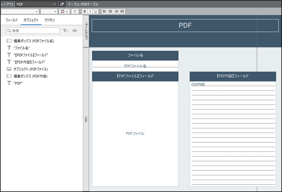 FileMakerのレイアウト上にPDFを格納するオブジェクトフィールドと、抽出結果を表示する計算フィールドを配置しました。