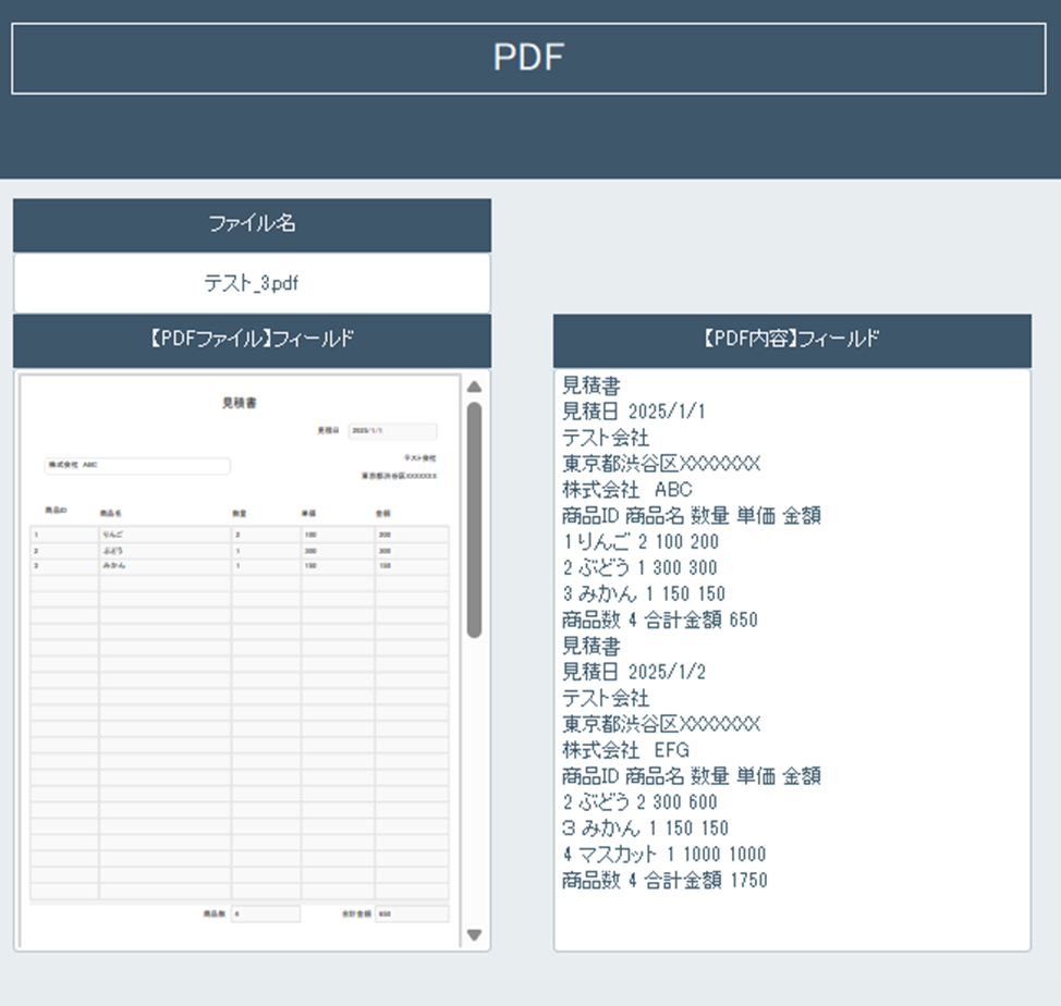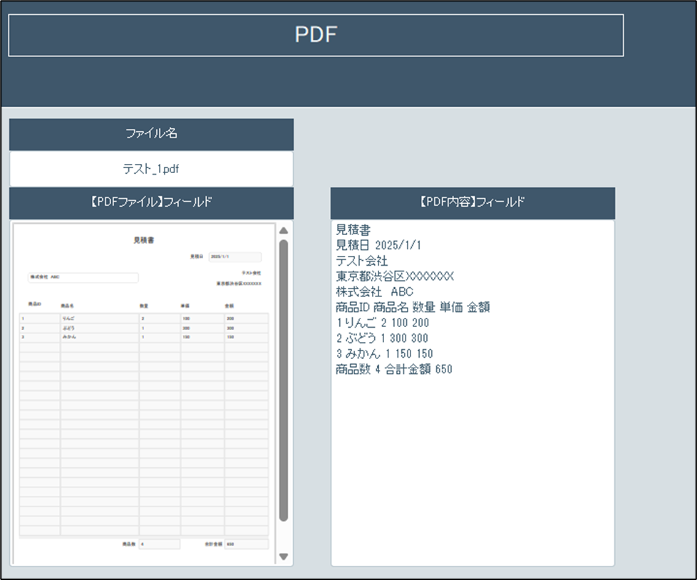 いよいよ本番です。PDFファイルをオブジェクトフィールドに格納してみると、計算フィールドにPDF内のテキストが瞬時に表示されました!