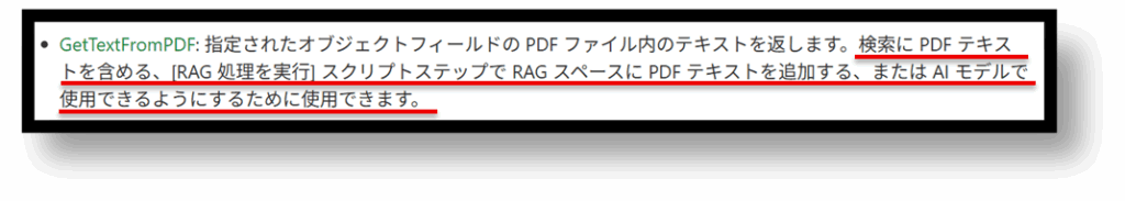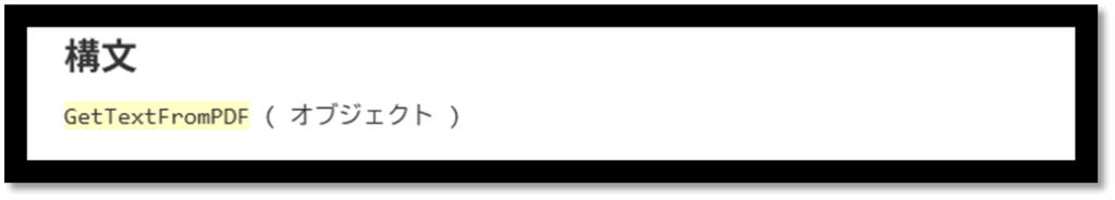 「指定されたオブジェクトフィールドの PDF ファイル内のテキストを返します。」と記述されており、その説明通り、PDFの内容をテキストで取得することが可能となります。