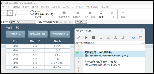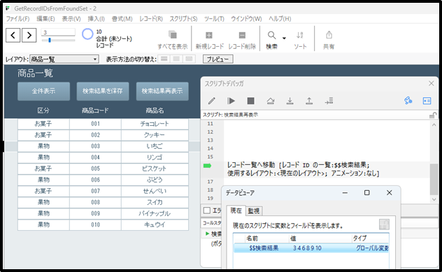 そしてその検索結果のレコードIDを$$検索結果という変数に、GetRecordIDsFromFoundSet(0)で保存します。