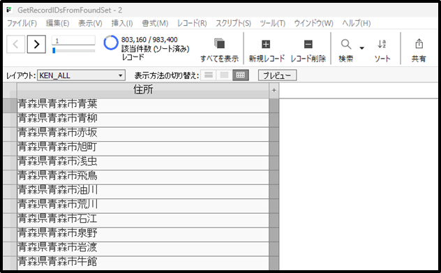 住所データが格納されている98万件のレコードの中から、住所に「県」が含まれる81万件のレコードが表示されている状態で、開発用レイアウトでレコード一覧へ移動して表示可能かを検証しました。