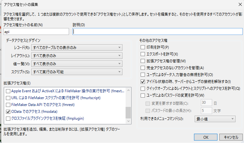 - 「ODataでのアクセス(fmodata)」にチェックを入れる