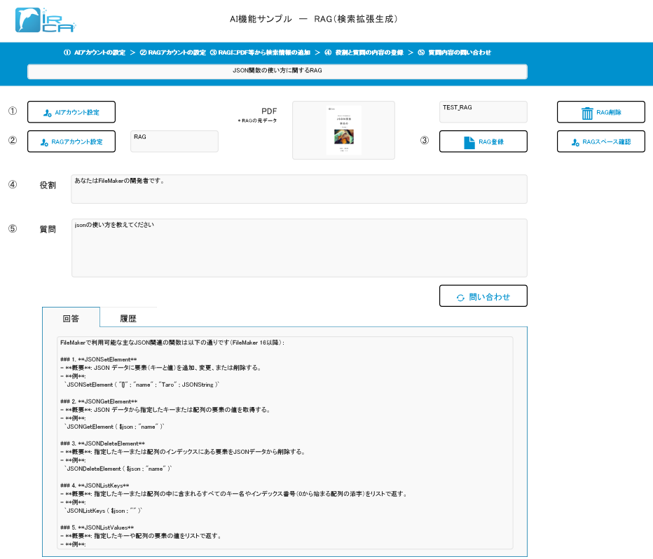 ここでは、FileMaker で構築したRAGサンプルアプリの画面を見ながら、具体的な機能と操作の流れをご紹介します。このアプリでは、FileMaker の技術資料(PDF)をRAGの知識ベースとして登録し、JSON関数に関する質問にAIが回答します。