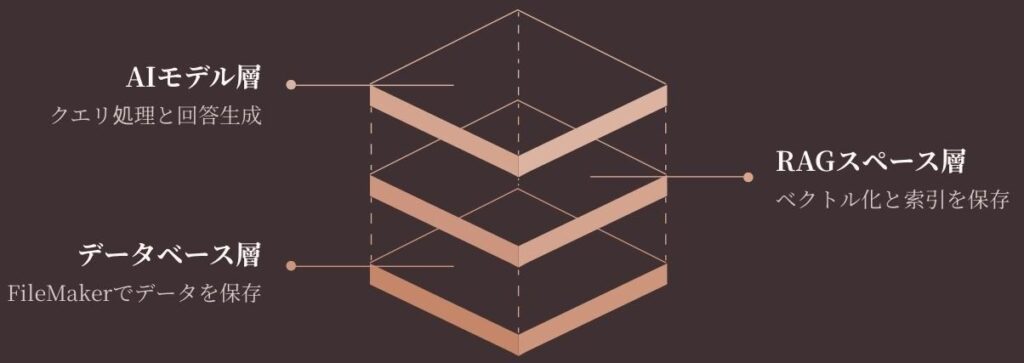 FileMaker を用いたRAGシステムは、主に以下の3層構造で構成されます。
