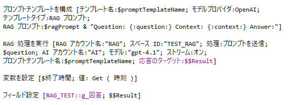 ユーザーの質問と役割、そして検索で取得したコンテキストを組み合わせてLLMへのプロンプトを生成し、APIを呼び出して回答を取得、フィールドに設定するまでの一連の流れの処理。